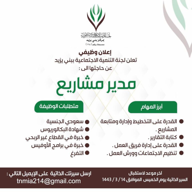 تعلن لجنة التنمية الاجتماعية ببني يزيد عن حاجتها الى مدير مشاريع